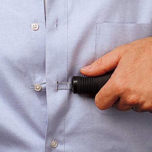 To use the device, you slide the prong through the hole and clasp the button and pull it through. It makes the fiddle task easier for those with poor dexterity or arthritis. The length of the handle is 110mm (4.25″), and the total length is 160mm (6.25″). Diameter of handle is 38mm (1.5″).